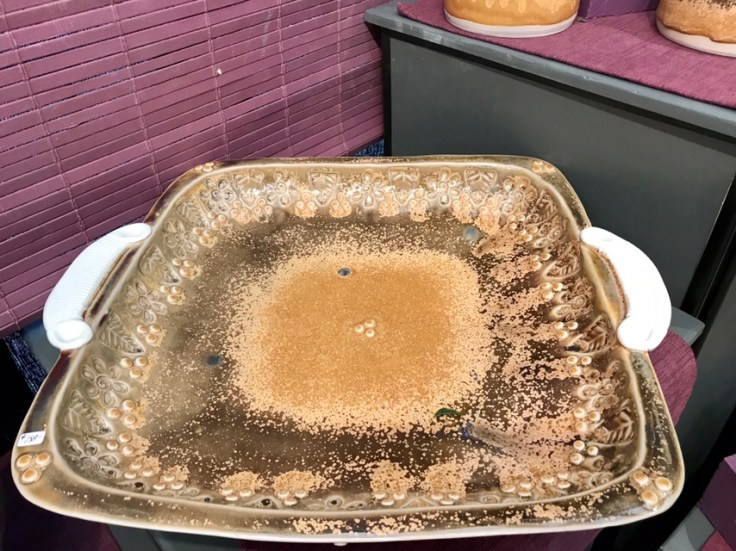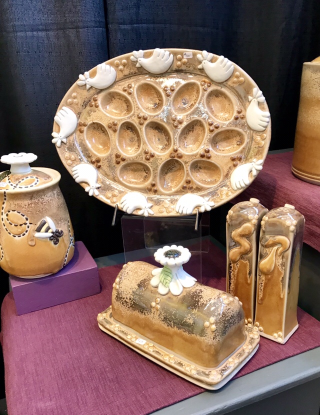 I use a high temperature grogless white Stoneware claybody made with locally mined ingredients from Loafers Glory, NC. It’s close to a porcelain type claybody but strong like stoneware. It is perfect for all your baking and serving needs as it is the strongest clay available. Some knobs/feet and handles are made with the whitest porcelain available anywhere and are left unglazed for the beauty, they clean up easy with either Comet or Dawn dish soap though dishwasher cleans it up nicely.